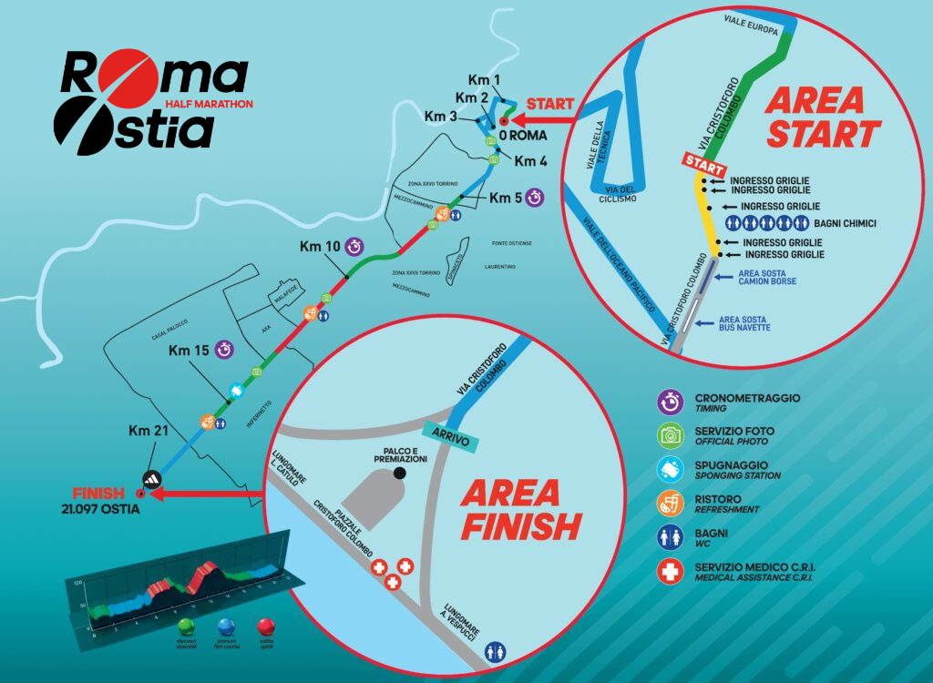 A circa 200 metri dall’arrivo si trova la fermata Cristoforo Colombo della Linea Ostia–Roma, con treni ogni 15 minuti. Si consiglia la fermata Magliana per chi deve tornare in zona partenza: da qui si prende la Metro linea B diretta all’EUR. Il viaggio di ritorno sul “trenino” con tanti compagni di corsa è l’esperienza finale dopo la gara. Un’alternativa è un pranzo a base di pesce sul mare.